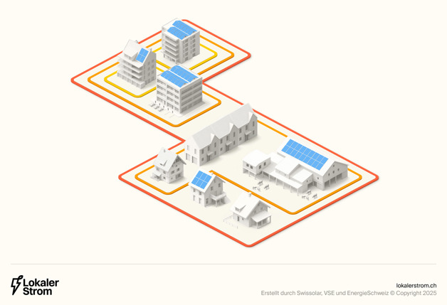 Die lokalen Strommodelle ZEV, vZEV, LEG haben unterschiedliche Reichweiten, vom Produktionsstandort (gelb) über Nachbarschaften (orange) bis zur Gemeindegrenze (rot). Die Plattform «lokalerstrom.ch» informiert über die Umsetzung und Vermarktung von lokalen Strommodellen (ZEV, vZEV, LEG) und stellt dafür praktische Tools und Vorlagen bereit. Sie wird von Swissolar, VSE und EnergieSchweiz betrieben. (Bild: Swissolar)