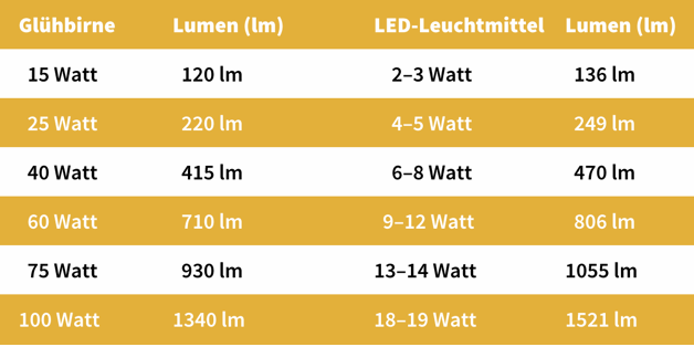 Der Verbrauch allein sagt allerdings noch wenig über die tatsächliche Lichtausbeute aus. Um ein Leuchtmittel zu beurteilen, sind zwei Faktoren entscheidend: Die Lichtabgabe gemessen in Lumen und der Stromverbrauch gemessen in Watt. Dabei gilt für alle Lichtspender: Je mehr Lumen, desto heller. Anders verhält es sich beim Verbrauch. Die Wattangabe von klassischen Glühbirnen kann nicht 1:1 auf LED angewendet werden. So entsprechen 40 Watt des Auslaufmodells zirka 6-8 Watt in der LED-Technologie. Diese Differenz verunsichert viele Konsumenten, da das Credo «Mehr ist mehr» noch immer fest in den Köpfen verankert ist. Trotzdem: Eine LED-Leuchte verbraucht nicht nur weniger Strom, sondern liefert gleichzeitig auch 10% mehr Lumen. Wer also viel Licht für wenig Watt möchte, der sollte zu LED greifen.