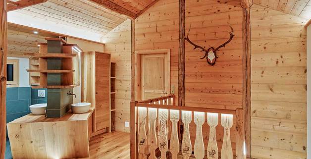 Le résultat est concluant, car avec DALI, le protocole de commande de la lumière, lequel est compatible avec KNX, il est possible de régler l’éclairage dans toute la maison. 14 groupes de lumière avec environ 40 luminaires, parmi lesquels des bandes LED variables ou alors des plafonniers encastrés extra-plats, permettent de mettre en scène avec vivacité des détails tels que les cerfs et les bouquetins incrustés au laser dans le bois. La généreuse salle de bain aussi est éclairée par de nombreuses diodes et il est même possible d’éclairer la main courante. L’effet déployé par les espaces généreux et ouverts sur les trois étages est soutenu par une lumière indirecte qui n’éblouit pas. «L’éclairage s’harmonise merveilleusement avec le vieux bois; il en résulte une ambiance lumineuse très spéciale. Tous les éclairages sont variables et il est aisément possible à l’avenir d’intégrer une commande par smartphone.»