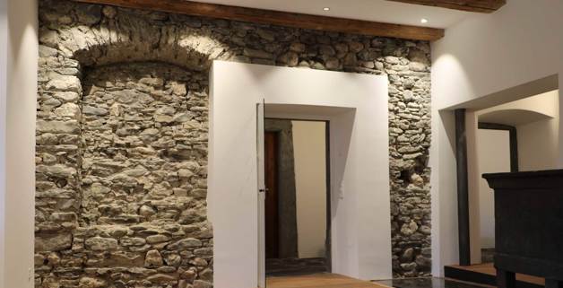 Si les maisons pouvaient parler, elles auraient certainement de belles histoires à raconter. La maison patricienne féodale, surmontée de corniches crénelées, a été construite au 16ème siècle, vraisemblablement par des serfs car la pierre naturelle devait être transportée jusqu’à Pratval/GR, ce qui a dû coûter beaucoup d’efforts. Située le long d’une ancienne route parcourue par les commerçants, la maison a certainement vu défiler une foule de voyageurs et a été le témoin de nombreuses rencontres. Il s’agissait donc d’un lieu de rassemblement – et telle a été la volonté des propriétaires lors de la rénovation du bâtiment: perpétuer l’histoire et recréer un lieu convivial de réunion. Mission accomplie grâce à une restauration soigneuse rehaussée d’une technique domotique de pointe.