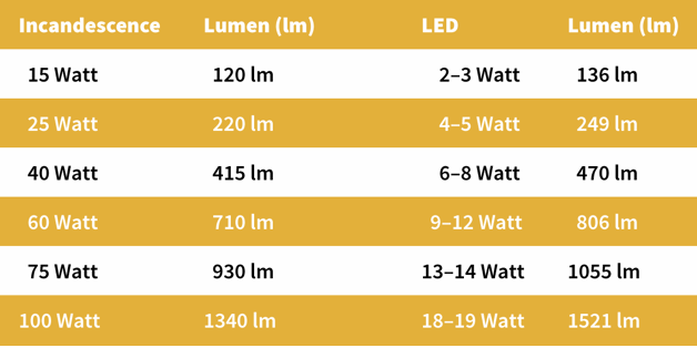 Mais la consommation à elle toute seule ne permet pas de cerner avec précision le bilan éco-énergétique effectif. Pour évaluer une source d’éclairage, deux facteurs sont déterminants : le flux lumineux mesuré en lumens et la consommation électrique mesurée en watts. Toute source lumineuse suit le principe suivant: plus il y a de lumens, plus la clarté est intense. Il en va autrement de la consommation. Il serait trompeur de comparer de façon indifférenciée les lampes à incandescence classiques aux LED en termes de watts : les 40 watts d’une lampe à incandescence équivalent à environ 6-8 watts de technologie LED. Cette différence sème le trouble chez beaucoup de consommateurs qui sont persuadés que «plus il y en a, mieux c’est». Pourtant, non seulement les ampoules LED utilisent moins de courant, mais elles diffusent 10% de lumens en plus. Par conséquent, si l’on cherche la luminosité maximum avec peu de watts, il convient de s’équiper de LED.