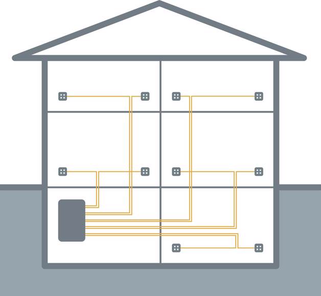 L’installazione di una rete multimediale dipende interamente dalle esigenze dei residenti. La dotazione di base comprende il montaggio di una scatola di distribuzione centrale, da cui i cavi a stella vengono portati nelle varie stanze. Le corrispondenti prese multimediali assicurano l’accesso a Internet, telefono e radio. In questo modo la casa è attrezzata perfettamente per le tendenze in rapida evoluzione della moderna comunicazione. Ed è anche estremamene flessibile se le esigenze mutano.